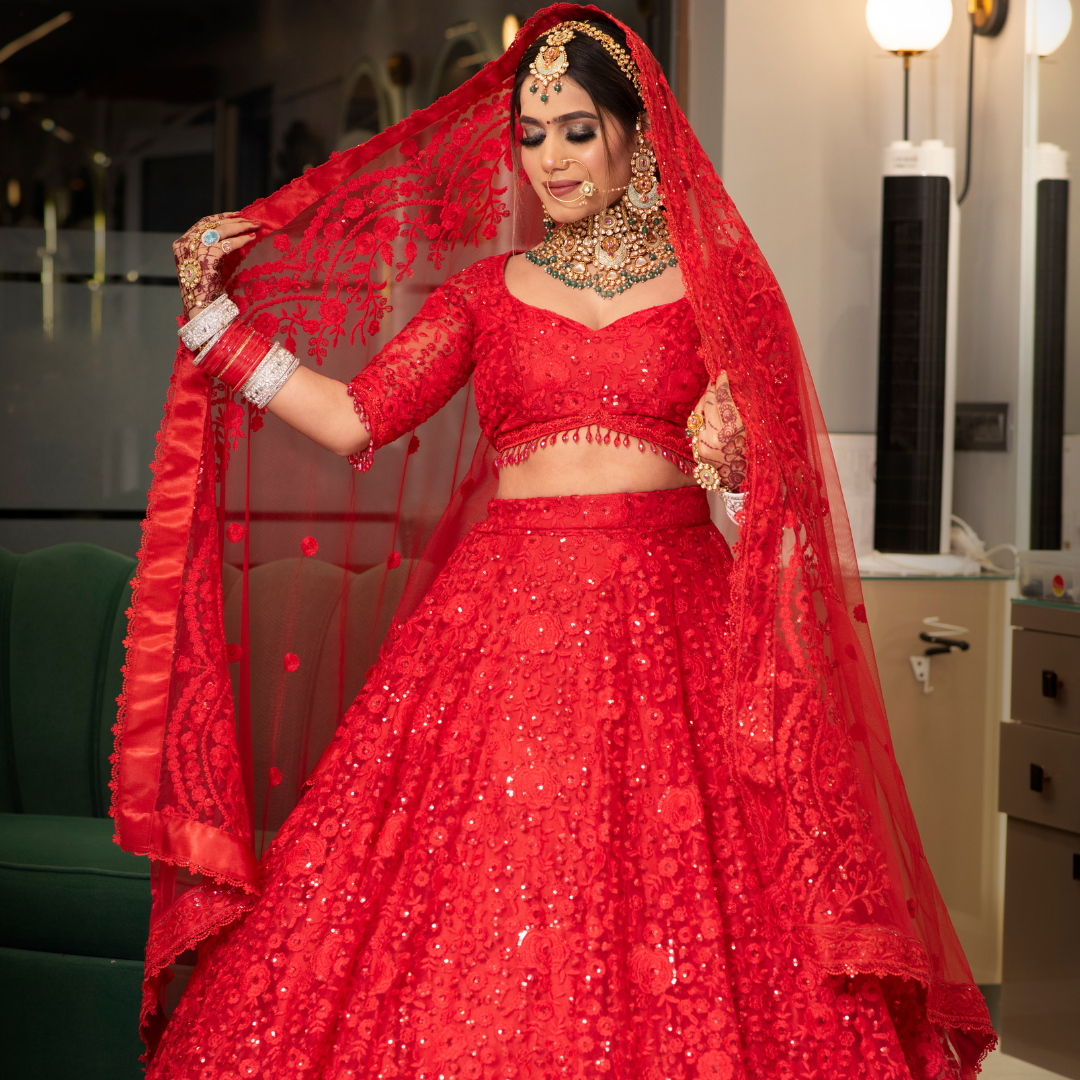 Elevate your bridal wardrobe with this stunning red sequined lehenga, a perfect blend of tradition and modern elegance. Crafted from high-quality sequined net fabric, this lehenga features intricate detailing that shimmers beautifully under any light, making it ideal for weddings and festive occasions.